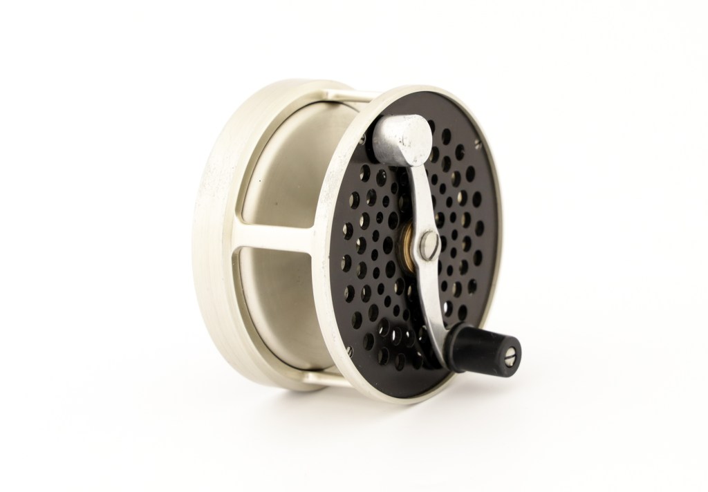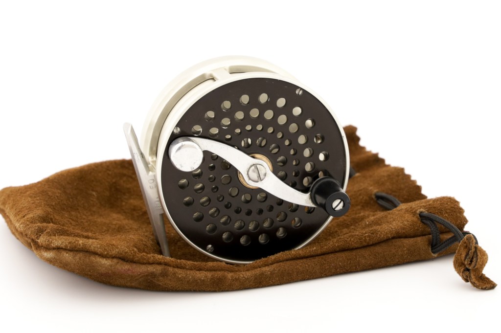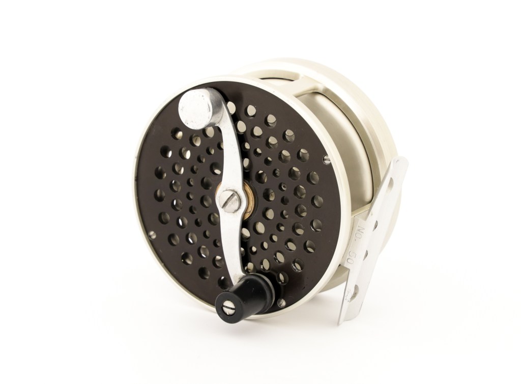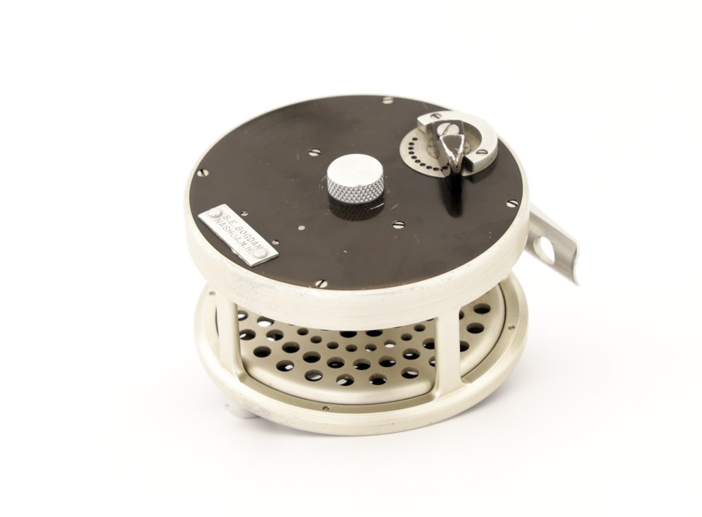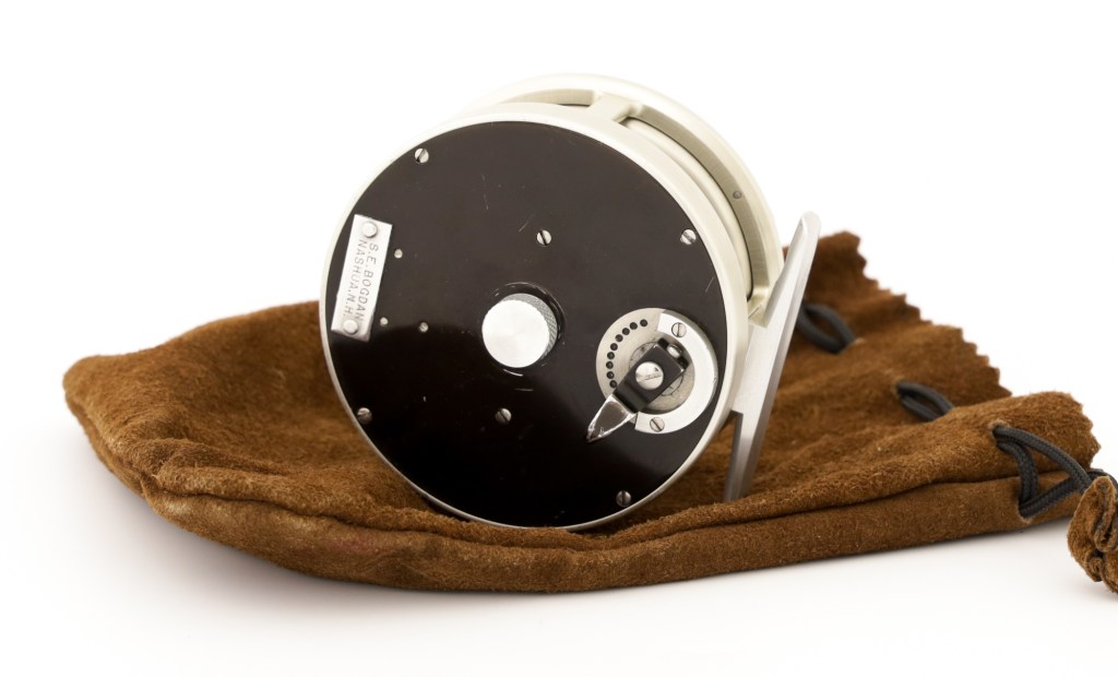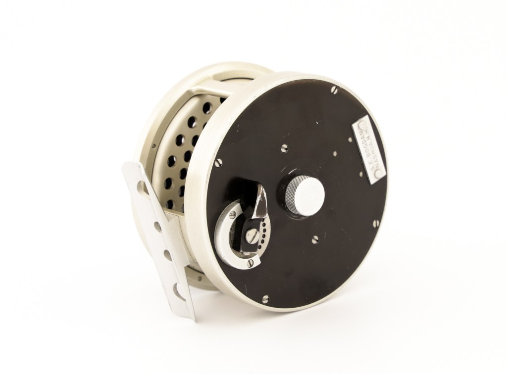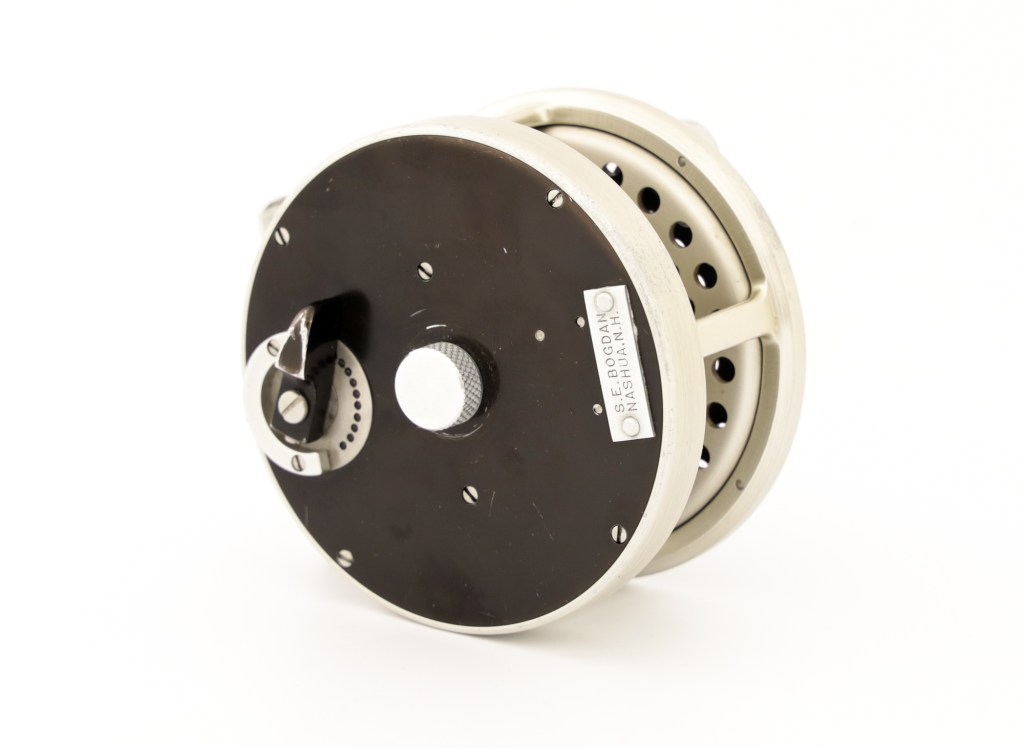 A fine early Bogdan model 50 reel. Rare reel without a poachers knob. Comes with can original leather pouch.
