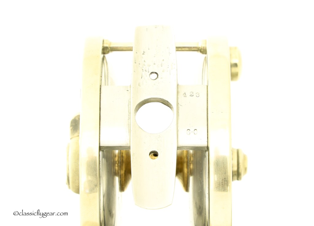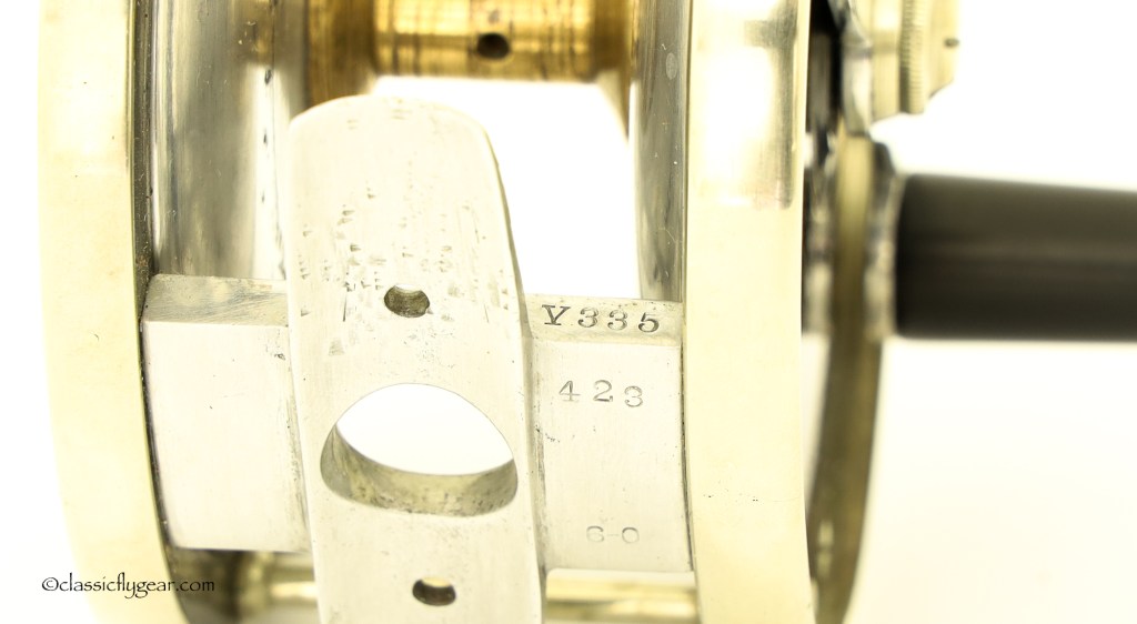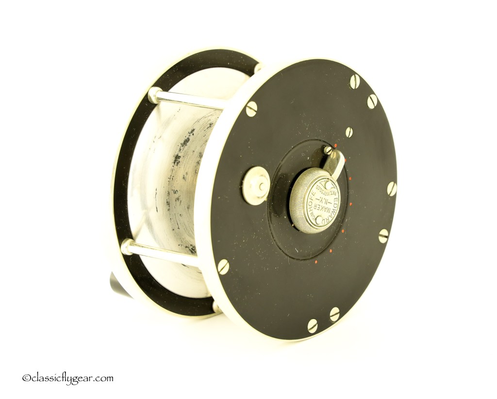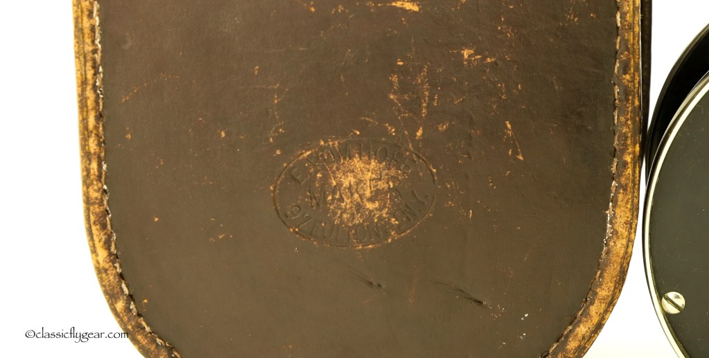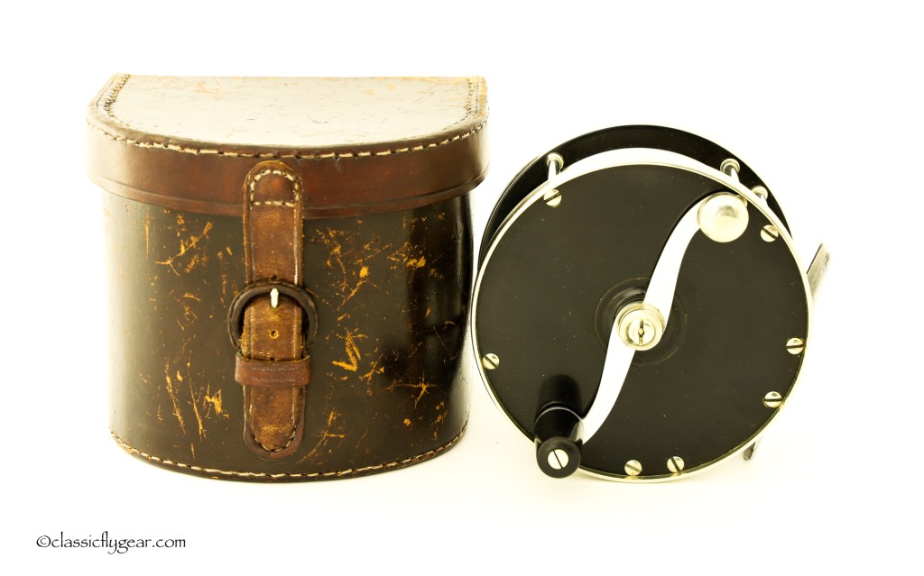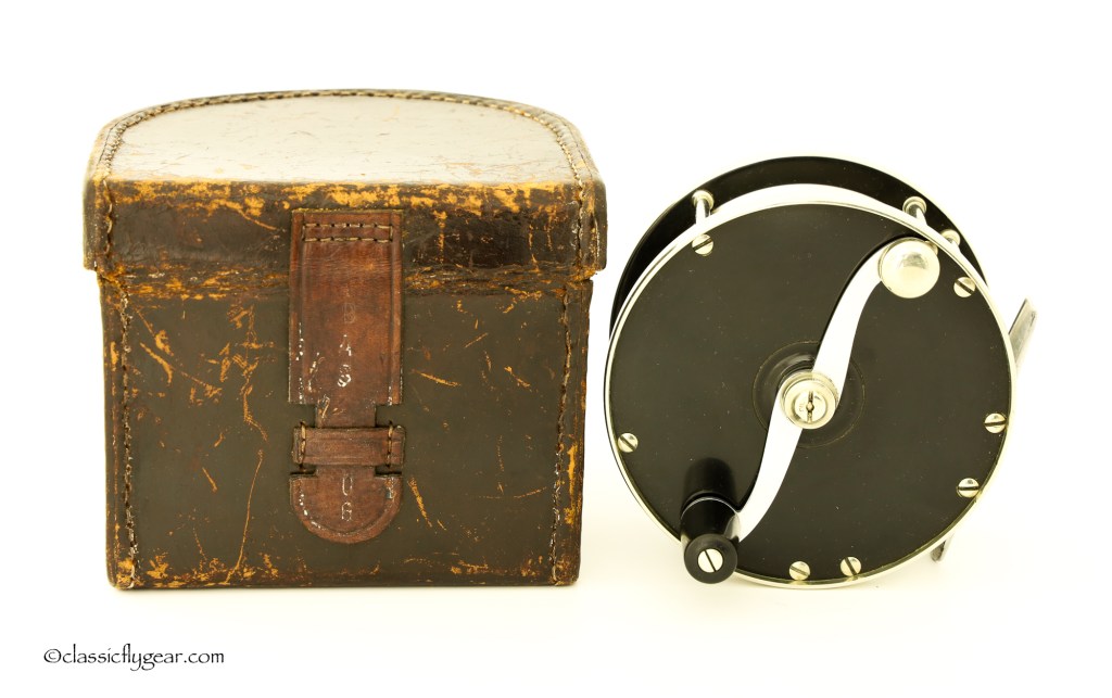A rare salmon reel by Edward Vom Hofe. Restigouche 6-0 with an original leather case. Serial number V335, made in 1929. Vom Hofe produced disc drag reels only one year, 1929, and most of the reels made with a disc drag were Tobique reels. Model Restigouche with disc drag is very hard to find.